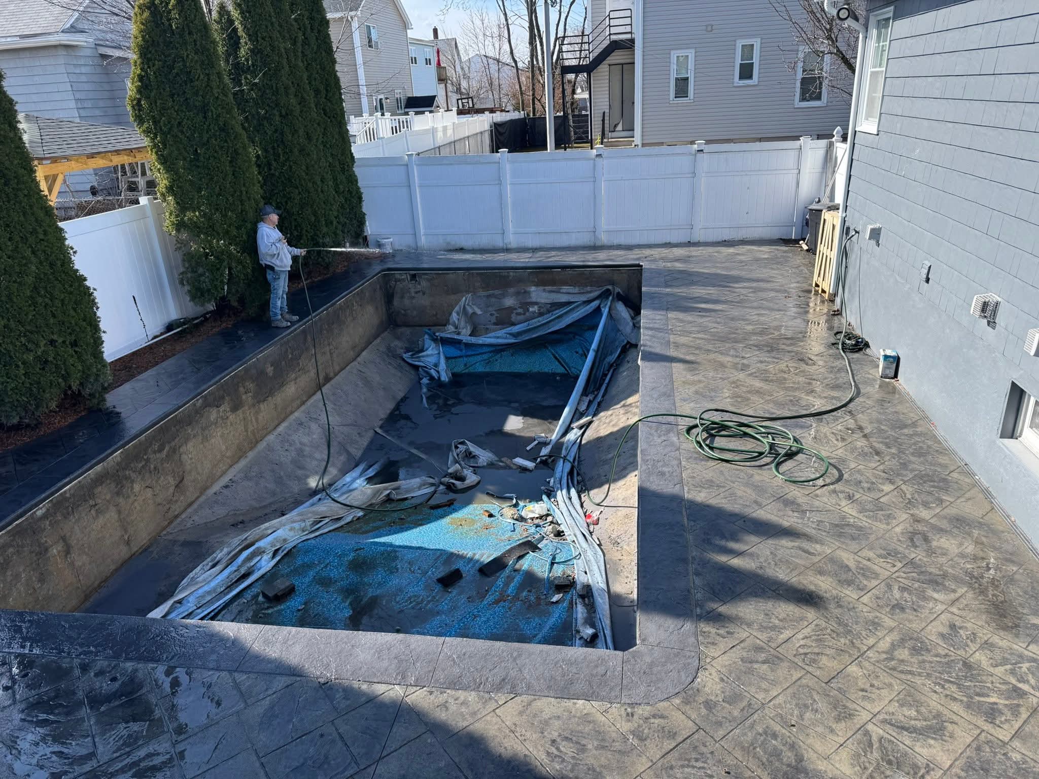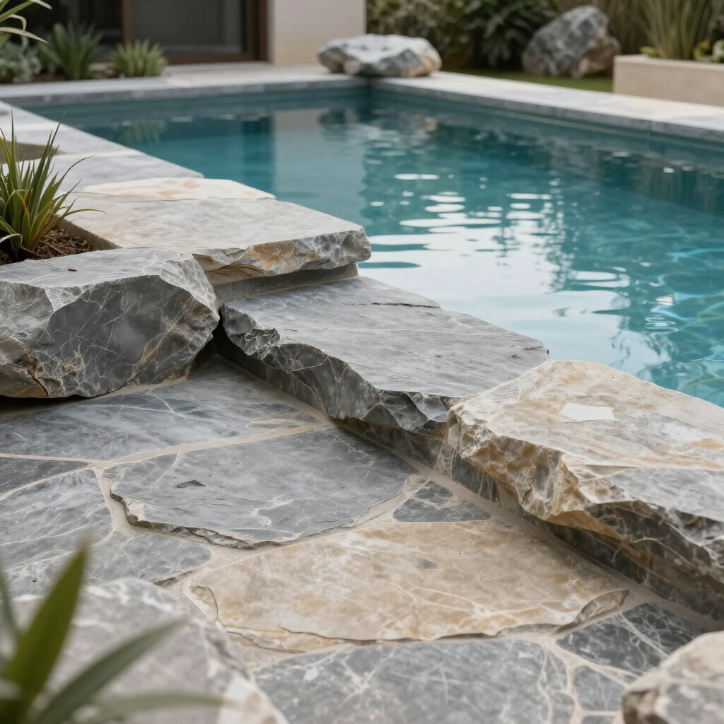 “Stamped concrete is regular concrete that’s pressed with patterned molds while it’s still wet. This lets us mimic the look of stone, brick, tile, or even wood at a lower cost. It’s durable, low‑maintenance, and great for pool decks because you get a custom, high‑end look with fewer joints and smooth, comfortable surfaces.”